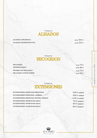 EXTENSIONES KERATINA MEDIANAS 3,90 %u20ac/unidadEXTENSIONES KERATINA LARGAS 4,90 %u20ac/unidadEXTENSIONES KERATINA EXTRA LARGAS 6,90 %u20ac/unidadEXTENSIONES ADHESIVAS 40cm 70 %u20ac/paqueteEXTENSIONES ADHESIVAS 50cm 85 %u20ac/paqueteEXTENSIONES ADHESIVAS 60cm 110 %u20ac/paqueteEXTENSIONESPeluquer%u00edaRECOGIDO desde 59 %u20acSEMIRECOGIDO desde 40 %u20acPRUEBA DE RECOGIDO desde 59 %u20acRECOGIDO ATEFE KABIRI desde 90 %u20acRECOGIDOSPeluquer%u00edaALISADO ORG%u00c1NICO desde 200 %u20acALISADO SEMIDEFINITIVO desde 250 %u20acALISADOSPeluquer%u00edaListado de Servicios 2025 %u00b7 PELUQUER%u00cdA