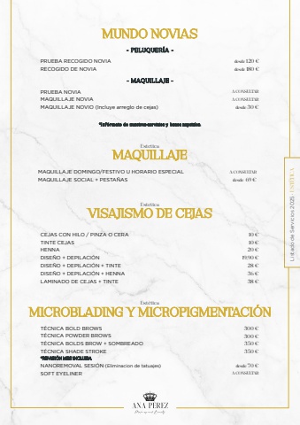 Listado de Servicios 2025 %u00b7 EST%u00c9TICAMUNDO NOVIAS PRUEBA RECOGIDO NOVIA desde 120 %u20acRECOGIDO DE NOVIA desde 180 %u20ac*Inf%u00f3rmate de nuestros servicios y bonos nupciales.PRUEBA NOVIA A CONSULTARMAQUILLAJE NOVIA A CONSULTARMAQUILLAJE NOVIO (Incluye arreglo de cejas) desde 30 %u20ac- PELUQUER%u00cdA -- MAQUILLAJE -MAQUILLAJE EsteticaMAQUILLAJE DOMINGO/FESTIVO U HORARIO ESPECIAL A CONSULTARMAQUILLAJE SOCIAL + PESTA%u00d1AS desde 69 %u20acVISAJISMO DE CEJASEsteticaCEJAS CON HILO / PINZA O CERA 10 %u20acTINTE CEJAS 10 %u20acHENNA 20 %u20acDISE%u00d1O + DEPILACI%u00d3N 19,90 %u20acDISE%u00d1O + DEPILACI%u00d3N + TINTE 28 %u20acDISE%u00d1O + DEPILACI%u00d3N + HENNA 36 %u20acLAMINADO DE CEJAS + TINTE 38 %u20acMICROBLADING Y MICROPIGMENTACI%u00d3NEst%u00e9ticaT%u00c9CNICA BOLD BROWS 300 %u20acT%u00c9CNICA POWDER BROWS 300 %u20acT%u00c9CNICA BOLDS BROW + SOMBREADO 350 %u20acT%u00c9CNICA SHADE STROKE 350 %u20acNANOREMOVAL SESI%u00d3N (Eliminacion de tatuajes) desde 70 %u20acSOFT EYELINER A CONSULTAR*REVISI%u00d3N MES INCLUIDA