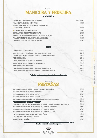 Listado de Servicios 2025 %u00b7 EST%u00c9TICAMANICURA Y PEDICURAEst%u00e9ticaLIMAR/RETIRAR PRODUCTO U%u00d1AS 6 %u20ac / 12 %u20acMANICURA BASICA + PINTAR 15 %u20acMANICURA SPA (EXFOLIANTE + MASAJE) ESMALTE NORMAL 22 %u20ac ESMALTADO PERMANENTE 32 %u20acESMALTADO PERMANENTE U%u00d1AS 25 %u20acESMALTADO PERMANENTE CON NIVELACI%u00d3N 29 %u20acALARGAMIENTO GEL/ACR%u00cdLICO/ACRYGEL 59 %u20ac RELLENO GEL/ACR%u00cdLICO/ACRYGEL 39 %u20ac*Todos los precios pueden variar seg%u00fan largura y decoraci%u00f3n.- MANOS -- PIES -LIMAR + CORTAR U%u00d1AS 9,90 %u20acLIMAR + CORTAR U%u00d1AS + ESMALTE NORMAL 22 %u20acLIMAR + CORTAR U%u00d1AS + ESMALTE PERMANENTE 26 %u20acPEDICURA SPA 28 %u20acPEDICURA SPA + ESMALTE NORMAL 36 %u20acPEDICURA SPA + ESMALTE PERMANTE 39 %u20acPEDICURA SPA DELUXE 38 %u20acPEDICURA SPA DELUXE + ESMALTE NORMAL 46 %u20acPEDICURA SPA DELUXE + ESMALTE PERMANENTE 49 %u20acPESTA%u00d1AS EsteticaEXTENSIONES EFECTO M%u00c1SCARA DE PESTA%u00d1AS 69 %u20acEXTENSIONES VOLUMEN NATURAL 75 %u20acEXTENSIONES VOLUMEN MEDIO 80 %u20acEXTENSIONES VOLUMEN TUPIDO 90 %u20acEXTENSIONES DISE%u00d1O ESPECIAL (Barbie, eyeliner, wispid) 95 %u20ac120 %u20acMANTENIMIENTO EXTENSIONES EFECTO M%u00c1SCARA DE PESTA%u00d1AS 38 %u20acMANTENIMIENTO EXTENSIONES VOLUMEN NATURAL 38 %u20acMANTENIMIENTO EXTENSIONES VOLUMEN MEDIO 43 %u20acMANTENIMIENTO EXTENSIONES VOLUMEN TUPIDO 49 %u20acRETIRADA EXTENSIONES DE PESTA%u00d1AS 15 %u20acLIFTING DE PESTA%u00d1AS + TINTE 38 %u20acTINTE DE PESTA%u00d1AS 10 %u20ac*Todos nuestros mantenimientos se cobran como mantenimiento entre los 14 y los 21 d%u00edas, sino se cobrar%u00e1 como primera puesta.*CUALQUIER DISE%u00d1O ESPECIAL %u201cFULL SET%u201d